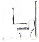| 側面に出入り口がある場合で、奥行きが140センチ程度の トイレでは、便器の正面にヨコ手すりをつけると、便器への 移動だけでなく、便器に座る、便器から立ち上がるなどの 動作をするときに身体を支えるのにも便利です。 |